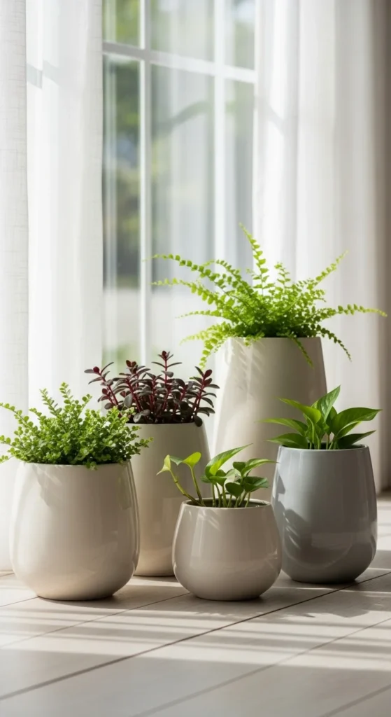 Planters matter as much as plants. Neutral ceramics keep greenery feeling calm and cohesive.