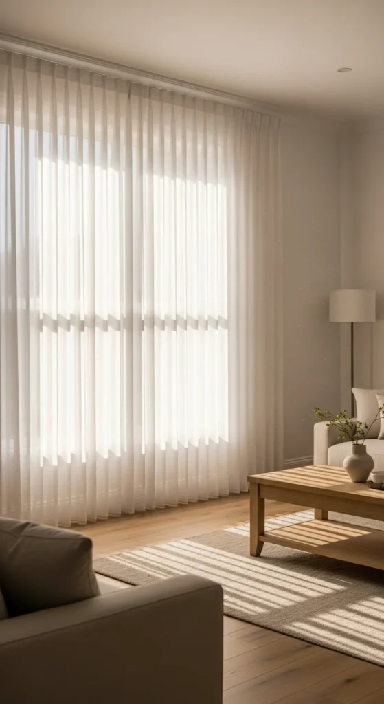 Sheer curtains soften windows instantly. They diffuse harsh light and add movement. Choose plain weaves. No shimmer. No heavy embroidery.