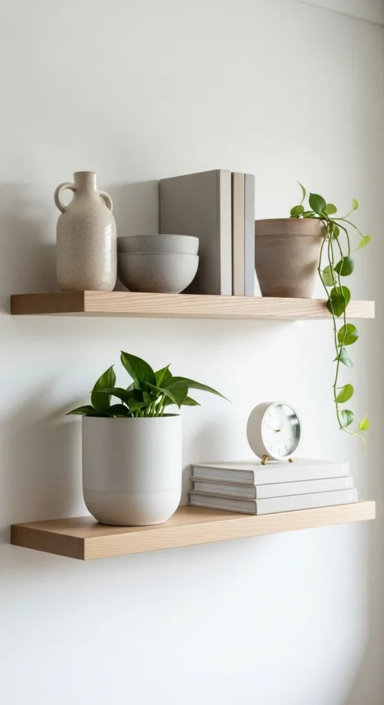Floating shelves keep walls light. Light wood tones feel warm without heaviness.