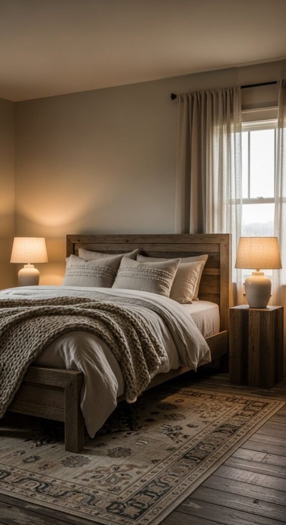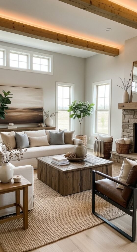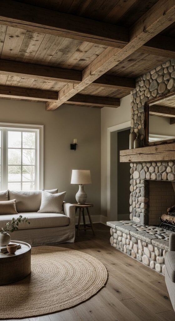 Warm greige walls replace stark white while staying neutral. This shade pairs well with wood, linen, and stone. Test samples at different times of day since light shifts tone. Use it throughout open layouts for cohesion or as a feature wall behind a bed or sofa. Greige balances rustic textures without feeling heavy. If repainting feels big, start with one room. Satin or eggshell finishes reflect light gently and hide wall flaws better than flat paint. Pair with black metal or aged brass accents for contrast.