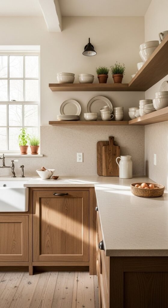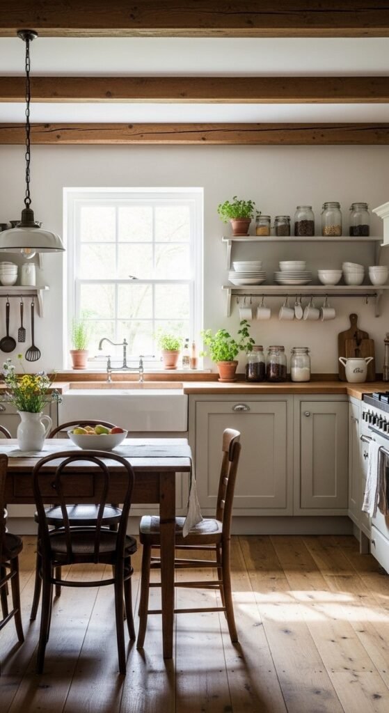 Shaker cabinetry keeps farmhouse kitchens grounded and calm. Flat panels and clean lines allow materials to shine without visual clutter. Warm neutrals work better than stark white and pair easily with wood or stone surfaces. If replacing cabinets isn’t an option, repaint existing doors in mushroom or greige tones. Swap hardware to aged brass or black metal for contrast. Keep upper cabinets simple when open shelving is nearby so the space feels balanced rather than busy.