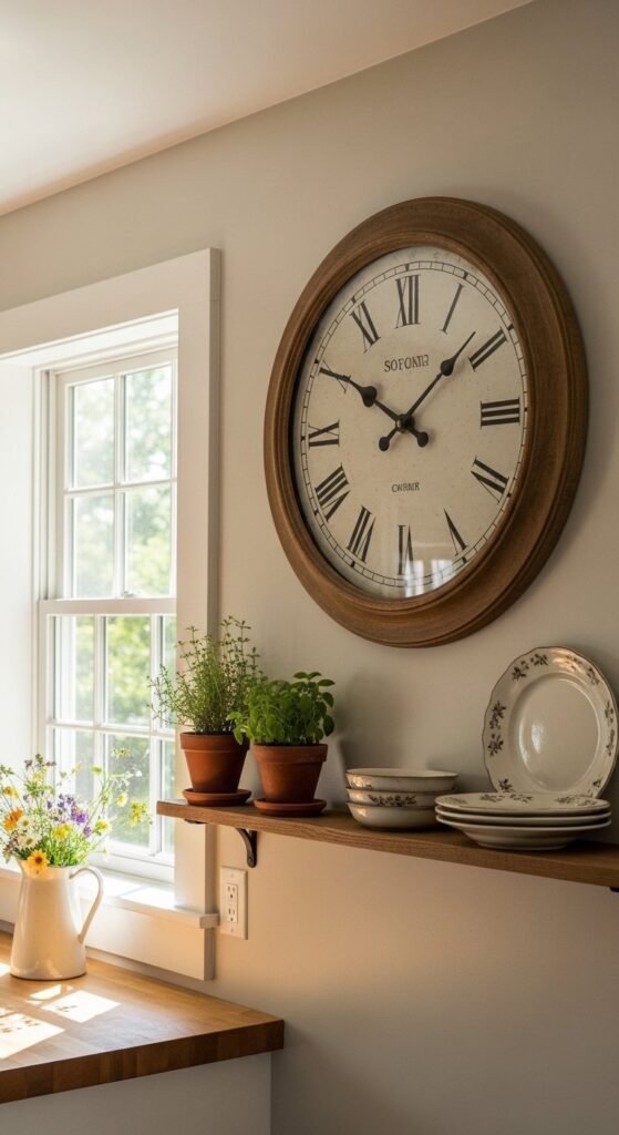 Wall clocks add character and function at the same time. Oversized designs work best on open walls or above doorways. Choose worn finishes rather than high shine. Roman numerals or simple numbers feel timeless. Thrift stores and flea markets often have solid options. Hang clocks where they can be seen without becoming a focal distraction.