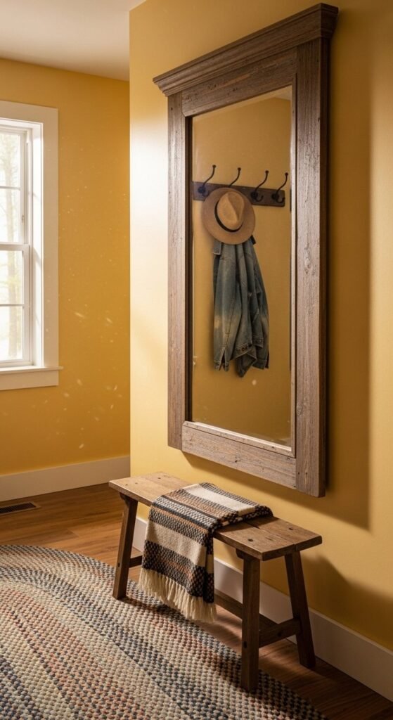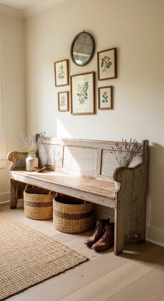 An entry bench creates a welcoming pause as you enter. Wood benches with visible grain feel grounded. Use baskets underneath for shoes or bags. Keep the top mostly clear with one pillow or small tray. This setup works in narrow hallways and open foyers alike. Painted or raw wood both fit the style when tones stay warm.
