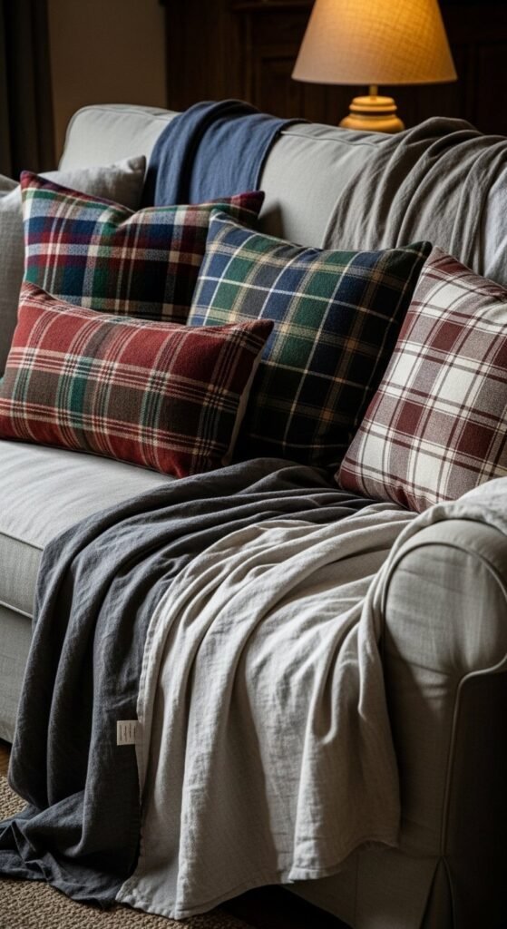 Plaid adds pattern without overwhelming a room. Stick to muted shades like cream, sage, or charcoal. Two pillows usually feel right. Mix plaid with solid linen or textured knits for balance. Removable covers make seasonal changes easy. Keep patterns subtle so the look feels relaxed rather than themed.