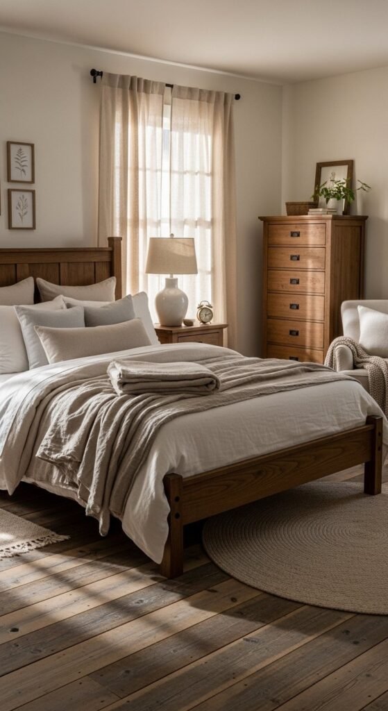 Mixing materials keeps farmhouse spaces from feeling flat. Pair wood with linen, leather, or stone for contrast. Keep forms simple so textures do the work. A wood table with metal legs or a linen sofa with leather pillows feels balanced. Limit each material to one or two appearances per room. This approach keeps the look calm and intentional. Thrifted pieces mix well with newer furniture when tones stay consistent.