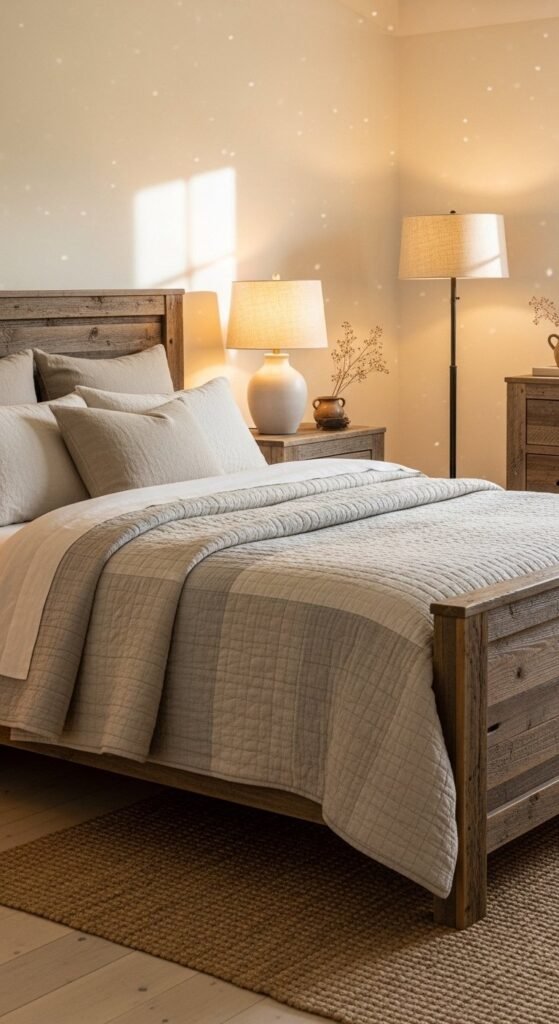 Quilted bedding adds comfort without bulk. Neutral shades keep bedrooms calm and timeless. Layer quilts over linen sheets for texture. Fold them halfway down the bed for casual styling. Thrifted quilts work well when colors stay soft. Keep patterns subtle so the bed feels restful rather than busy.