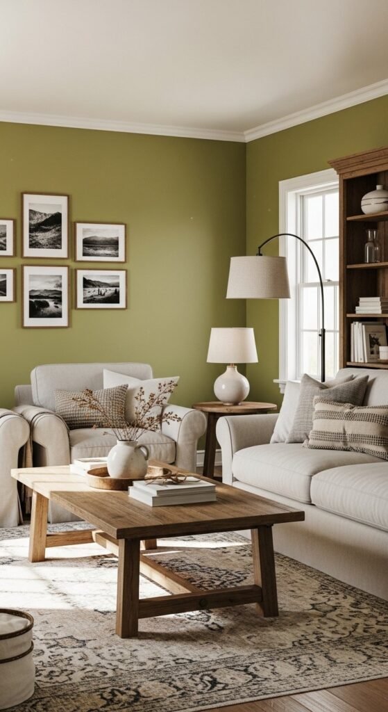Feature walls personalize farmhouse spaces without overwhelming them. Earthy greens, clay tones, or muted burgundy feel current and warm. Use one wall only so the room stays calm. Pair with wood accents and simple art. Matte paint finishes keep colors grounded. This works well in living rooms, bedrooms, or dining areas where you want subtle depth.