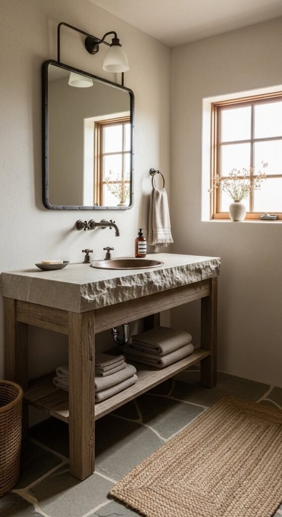 Wood vanities soften bathrooms instantly. Visible grain keeps the look organic. Pair with stone or concrete-style tops for balance. Keep plumbing finishes muted so the vanity remains the focus. Floating styles work in smaller bathrooms and keep floors visible. Storage baskets underneath add function without crowding the space.