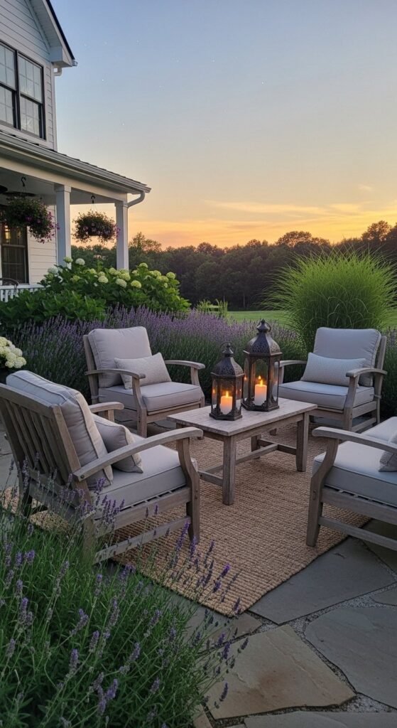 Outdoor wooden seating extends farmhouse charm beyond the house. Simple chairs or benches feel relaxed and welcoming. Neutral cushions keep the look cohesive with interiors. Weathered wood ages naturally and fits the style well. Add lanterns or soft lighting to make the space usable after sunset. Keep accessories minimal so seating stays the focus.