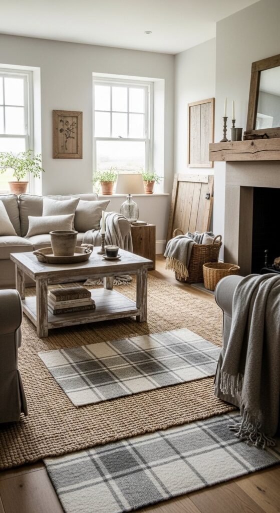 Layering rugs adds comfort and texture fast. Start with a jute rug to ground the space. It’s durable and affordable. Place a smaller wool or cotton rug on top for softness. Plaid or subtle patterns nod to country style without overpowering the room. This setup works well in rentals and helps disguise worn floors. Keep colors muted—cream, tan, soft gray, or sage. Size matters. The base rug should extend under the main furniture while the top rug can float. Swap the top layer seasonally for easy visual change without buying new furniture.