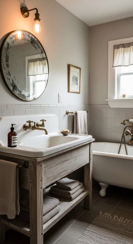 Vintage-style fixtures bring subtle nostalgia to bathrooms. Cross handles and warm metals feel collected rather than trendy. Swapping faucets and towel bars creates visible change without renovation costs. Aged brass and copper feel softer than chrome. Pair fixtures with simple white tile and wood-framed mirrors for balance. Salvage shops sometimes carry authentic pieces, but reproductions work well when finishes stay muted. Keep accessories minimal so the fixtures remain the highlight.