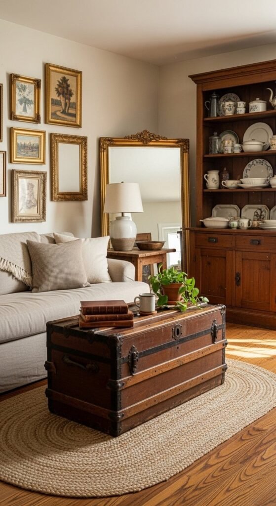 Use one thrifted item as an anchor. A trunk can replace a coffee table and hide blankets. Old crates stack into side tables. Vintage art fills walls without feeling staged.