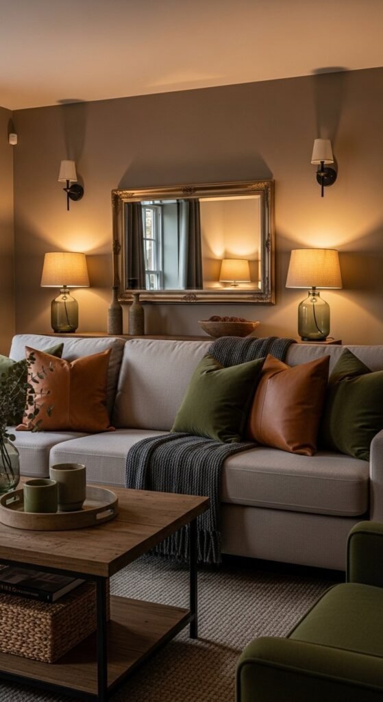 Lighting changes how color reads. Warm bulbs make deeper tones feel cozy, not heavy. Richer accents add depth without changing the whole room when used in small doses.