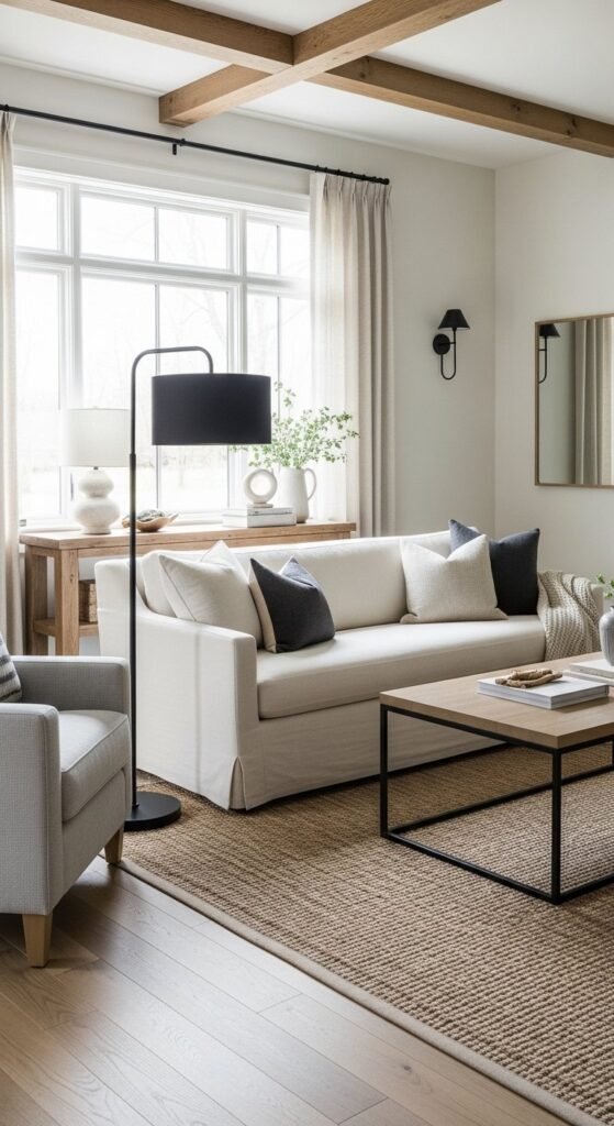 Think of black as punctuation. It defines the space, not dominate it. When used lightly, it keeps farmhouse rooms from tipping into overly sweet territory.