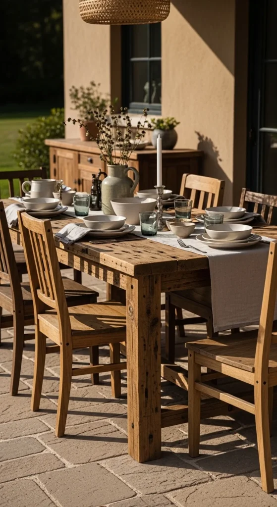 A reclaimed wood dining table sets the tone for a grounded patio. The grain tells its own story. Look for salvaged beams or old decking boards. Many local yards sell by the plank. Sand lightly. Keep imperfections. Seal with outdoor oil instead of shiny coatings. That keeps texture visible. Pair with mixed chairs for a relaxed look. Benches save space and cost less. For tight patios, shorten the table length and push one side against a wall. Style with linen runners and stoneware. Skip formal place settings. Let wear show over time. That’s part of the charm. This setup works well for casual outdoor meals and long evenings without fuss.