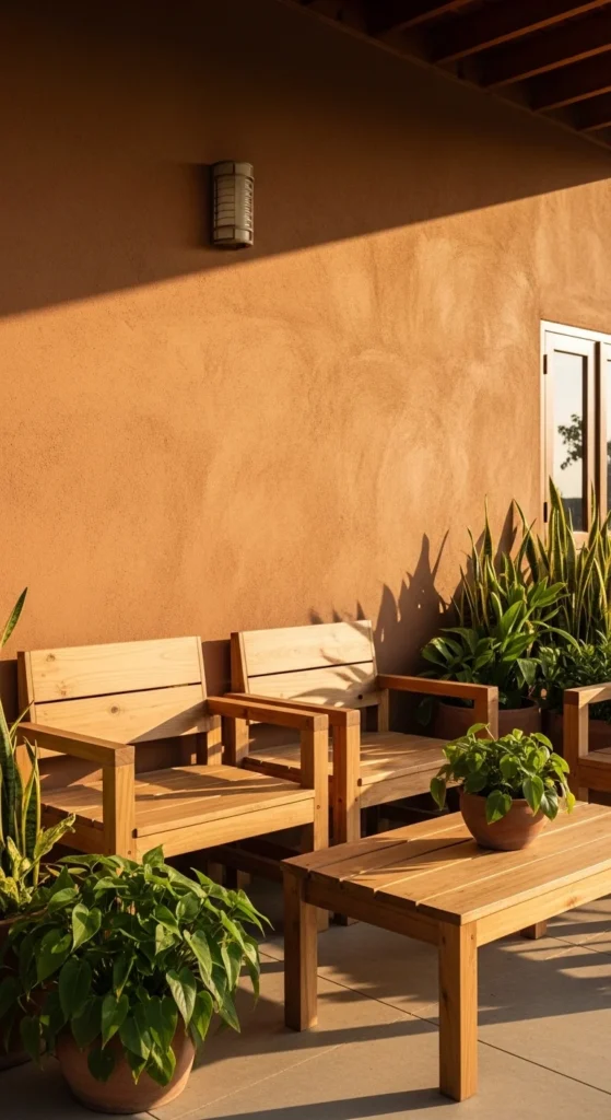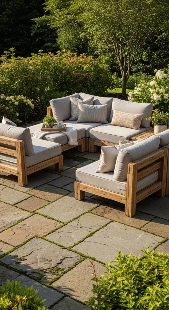 Modular seating adapts easily. Wood frames feel warmer than metal. Straight cuts keep the look simple. Rearrange sections for meals or lounging. For smaller patios, start with two pieces. Add more later. Keep cushion colors muted so fading looks natural. Store cushions during storms. Wood weathers gracefully with oil maintenance once a year. This setup allows flexible outdoor layouts while keeping a grounded rustic feel.