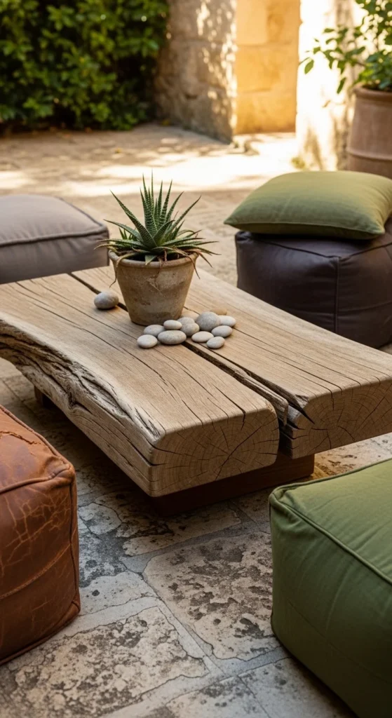 A rough-hewn table grounds a seating area. Thick slabs or stacked wood blocks work well. Keep the height low so it feels casual. Skip decorative legs. Let the wood speak. Seal lightly to protect from spills. Scratches blend in over time. This piece handles weather and heavy use without worry. It pairs well with benches or low chairs. If sourcing wood is tough, laminate boards together and rough the edges by hand. This table supports laid-back lounging and daily use without maintenance stress.
