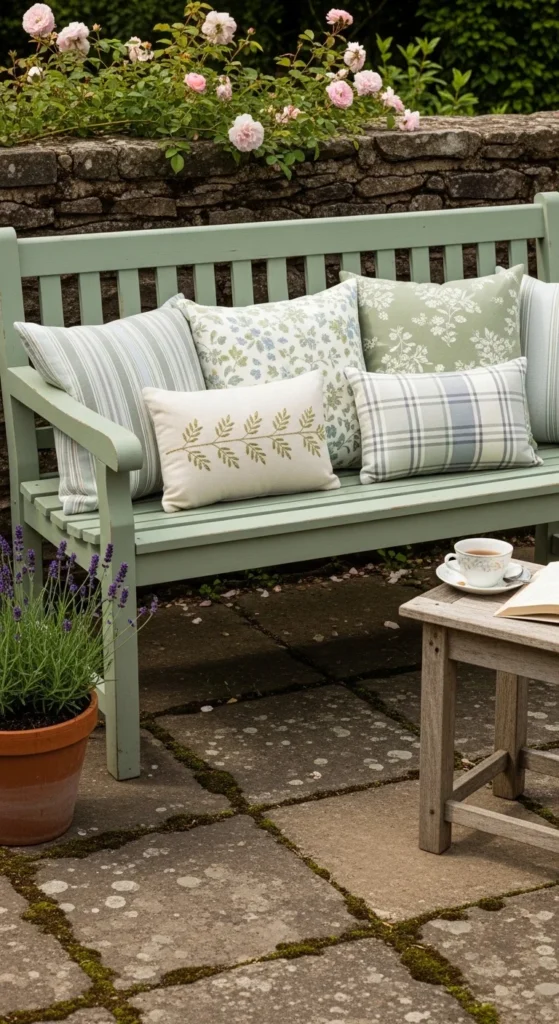 A painted bench brings cottage charm to a rustic patio. Muted greens, creams, or soft blues work best. Light sanding ensures paint sticks, and cushions add pattern and comfort. Position in a cozy corner or against a wall. Small planters nearby enhance the cottage vibe. Over time, chips and wear add character. This bench supports relaxed, inviting seating without heavy furniture.