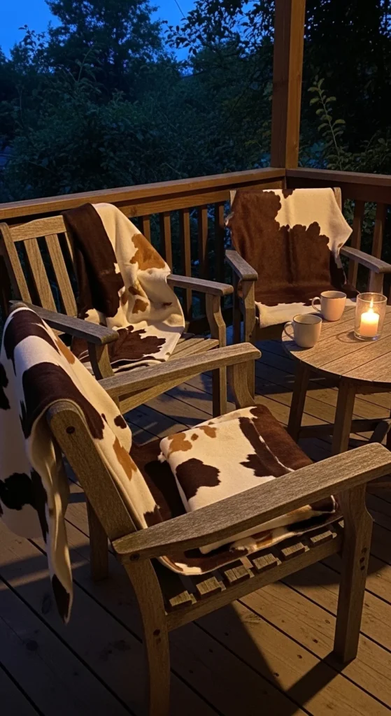 Throws add warmth and texture to benches or chairs. Faux hides dry faster and survive outdoor conditions better. Drape casually over backrests or fold on seats. Remove during rain. Patterns create visual interest against plain wood. This simple detail enhances cozy campfire-style seating while keeping setup flexible and low-cost.