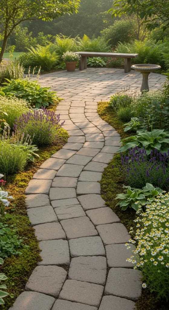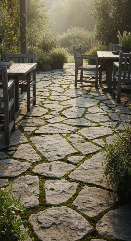 Stone pavers bring weight and permanence. Irregular shapes feel older and more relaxed. Dry-set installation saves money and allows water drainage. Use compacted gravel as a base. Fill gaps with decomposed granite or creeping ground cover. Local stone often costs less and blends better with the landscape. For renters, place large stepping stones over gravel to mimic the look. Avoid tight grout lines. Let spacing vary. Pair stone with wood furniture to soften the feel. This surface stays cool underfoot and supports natural outdoor flow without heavy construction.