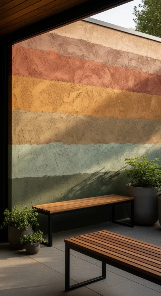 Layered pigment blocks create an abstract, earthy backdrop. Use muted tones of clay, ochre, and sage. Paint in uneven sections to mimic natural strata. Matte finishes prevent glare and highlight texture. This artistic approach adds visual depth and rustic artistry without complicated construction or permanent alterations.