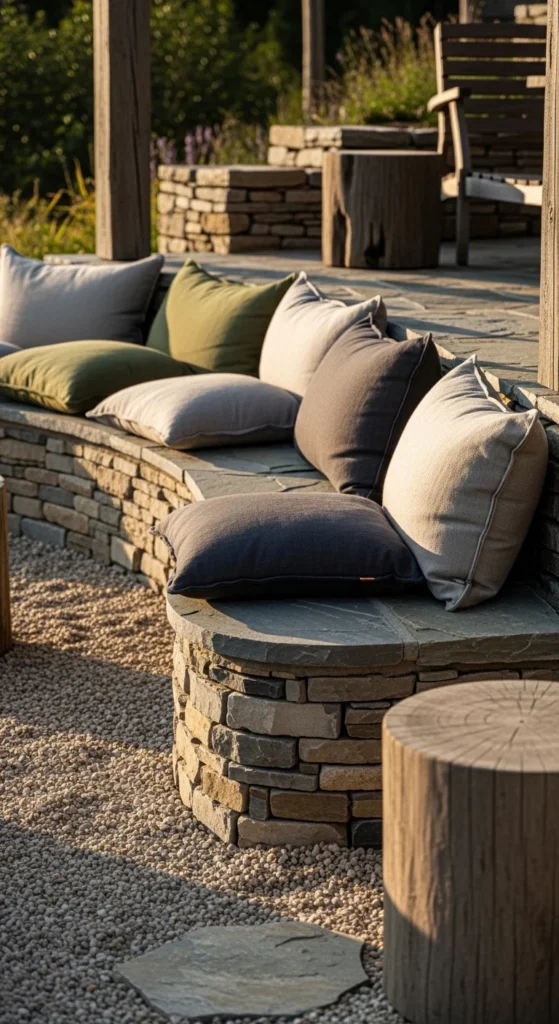 Curves soften patios dominated by straight lines. A low stone wall doubles as seating and boundary. Dry-stack stone for a handmade look. Slight gaps are fine. Cap with flat stones for comfort. Add cushions only when guests arrive. They store easily. This approach saves space compared to chairs. It also guides movement naturally. Start with a short curve if you’re DIY-ing. Even a small arc changes the feel. This feature creates natural gathering spots without crowding the patio or adding furniture bulk.
