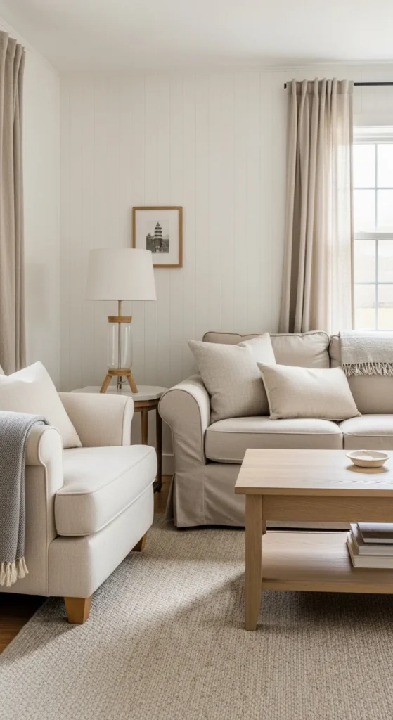Neutral colors help small rooms feel open and calm. Whites, creams, and warm beiges bounce light around the space. They also give you more flexibility when styling later. Start with walls and large furniture in soft neutrals. Add contrast through wood tones and subtle patterns. If painting feels intimidating, try peel-and-stick wallpaper in a pale linen look. Slipcovers in off-white cotton are another low-cost option. Keep the ceiling slightly lighter than the walls to visually lift height. Layer in warmth using throws or pillows instead of bold paint. This approach creates an airy farmhouse foundation that never feels heavy.