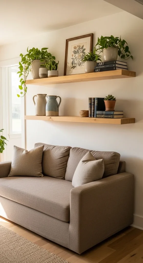 When floor space runs out, look up. Floating shelves pull storage off the ground while adding style. Use reclaimed wood or stained pine for farmhouse character. Keep displays simple. Stack a few books. Add one plant. Place a small basket for hidden items. Leave breathing room between objects. For budget installs, use heavy-duty L-brackets painted white and add a wood plank on top. Mount shelves higher than eye level to make ceilings feel taller. This trick delivers clutter-free coziness without crowding furniture.