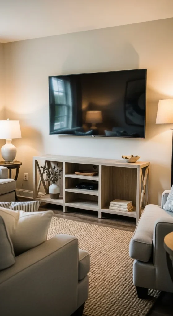 Short, narrow consoles keep sightlines open. Look for open shelves instead of closed cabinets. Use baskets to hide electronics. Mount the TV slightly above the console to free surface space. Avoid bulky hutches or tall units. This setup creates visual breathing room around technology.