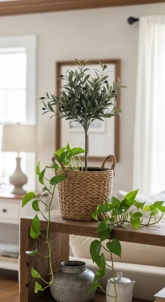 Plants soften hard edges. Choose one floor plant and one shelf plant. Stick to easy varieties like pothos or snake plants. Use clay pots or woven baskets. Faux plants also work when chosen carefully. Keep foliage minimal. Greenery adds natural softness without crowding surfaces.