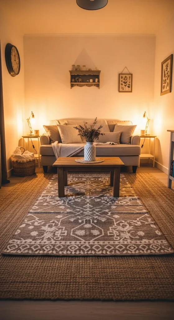 Layering rugs adds texture and helps define seating zones. Start with a large jute rug. Place a smaller patterned rug on top. Keep colors muted. This also helps soften sound in small rooms. Look for thin rugs so layers sit flat. You get a cozy definition without walls.