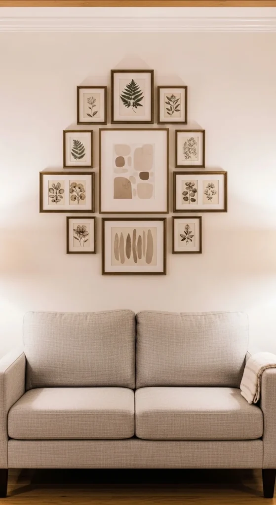Vertical gallery walls shift focus upward. This makes ceilings feel taller. Choose simple frames in wood, black, or white. Keep artwork within a soft color palette. Lay the layout on the floor before hanging. Start from the center and work outward. Mix art sizes, but keep spacing consistent. This creates height-enhancing visual flow without filling floor space.