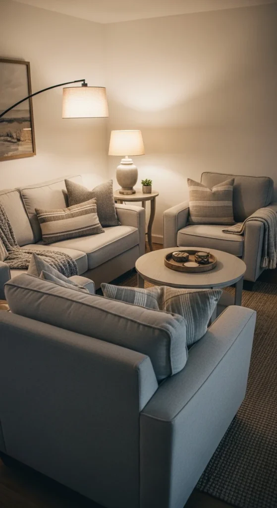 Avoid pushing all furniture against walls. Angle seating slightly toward each other. Use a round coffee table to soften the layout. Keep walkways clear. This creates a welcoming zone for talking and relaxing. It also prevents the room from feeling like a hallway. You get better flow and comfort with the same furniture count.