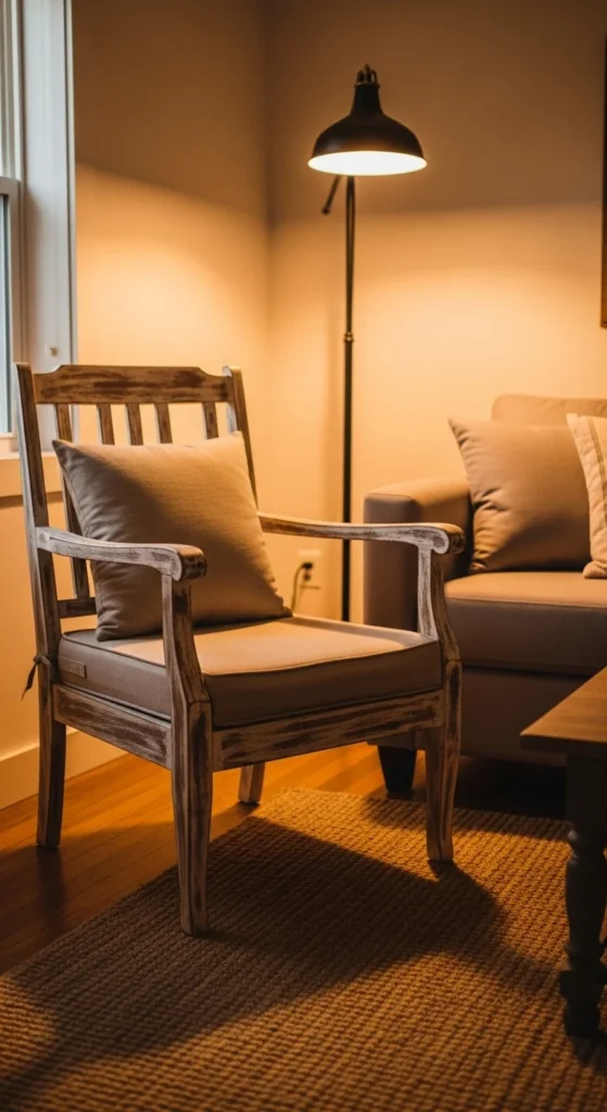 One statement chair can replace a bulky loveseat. Look for slim frames with visible wood grain. Pair with a simple cushion. Sand and stain secondhand chairs for quick updates. Keep upholstery neutral. This adds seating plus authentic farmhouse character without crowding.