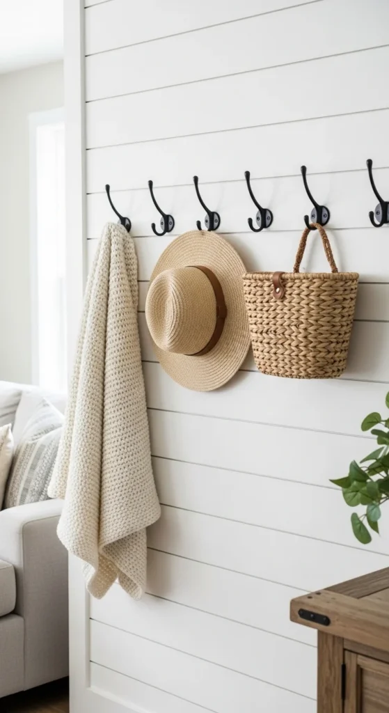 Wall hooks handle everyday items. Hang throws, hats, or small bags. Install near seating or entry points. Choose simple metal or wood hooks. Keep spacing even. This frees drawer and basket space. You gain easy-access storage that doubles as decor.