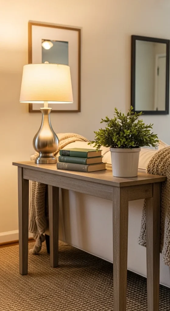 A slim console behind the sofa adds function without stealing floor space. Choose tables under 12 inches deep. Use the surface for a lamp and small decor. Add baskets underneath for hidden storage. This creates extra utility in unused space and keeps side tables optional.