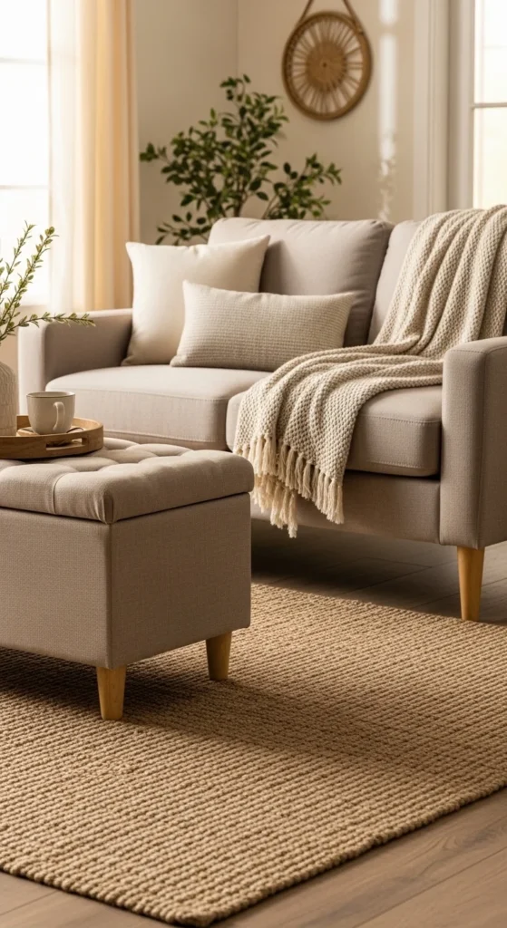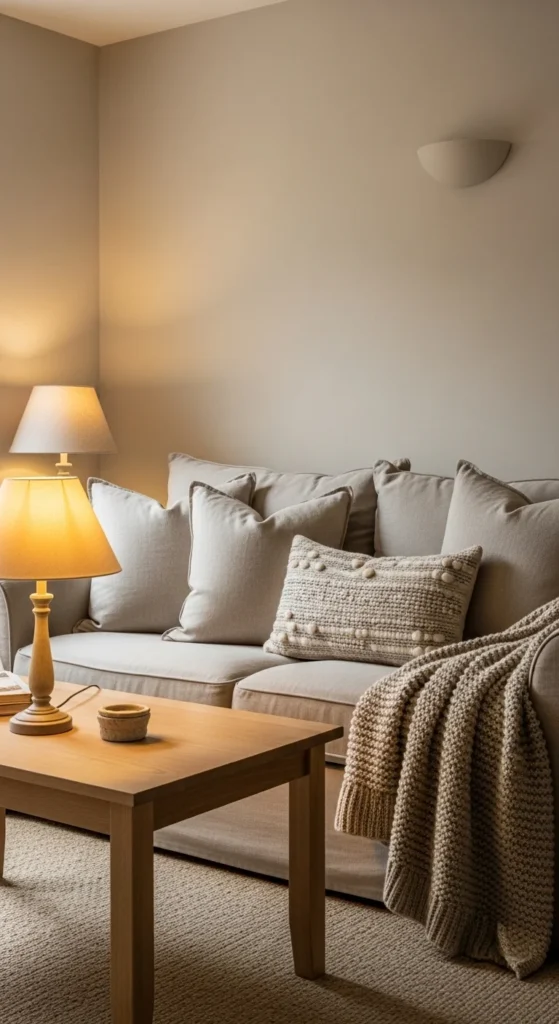 Layering textiles adds warmth without using extra floor space. Mix linen, cotton, wool, and subtle knits. Stick to a tight color range so patterns don’t overwhelm. Start with two pillows, then add one textured throw. Rotate seasonally to keep things feeling new. Look for pillow covers instead of full inserts to save money. Washable fabrics make everyday life easier. This approach creates rich texture without visual noise.