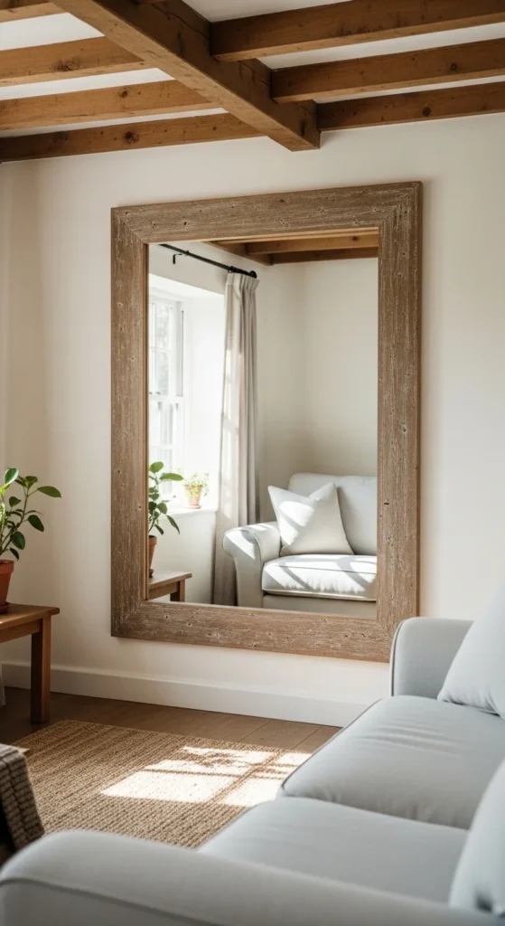 Mirrors double the impact of natural light. Hang one directly across from a window when possible. Choose simple wood or distressed frames. Large mirrors work better than clusters. Leaning floor mirrors also work in tight spaces. Thrift stores often have solid frames that only need paint. Keep the surrounding wall decor minimal. This single change creates a bigger-feeling room with very little effort.