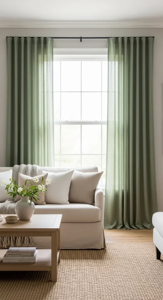 Linen curtains soften light beautifully. Green tones add calm without blocking brightness. Hang high to elongate walls. Use lightweight fabric. Avoid heavy lining. For budget options, dye white linen panels at home using fabric-safe dye.
