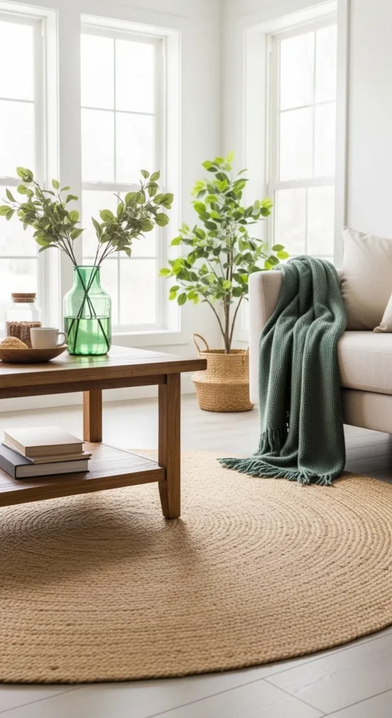 Jute grounds green decor naturally. It pairs well with plants and wood. Layer with green textiles for contrast. Avoid damp areas. Rotate rug to prevent wear. Choose tight weaves for durability.