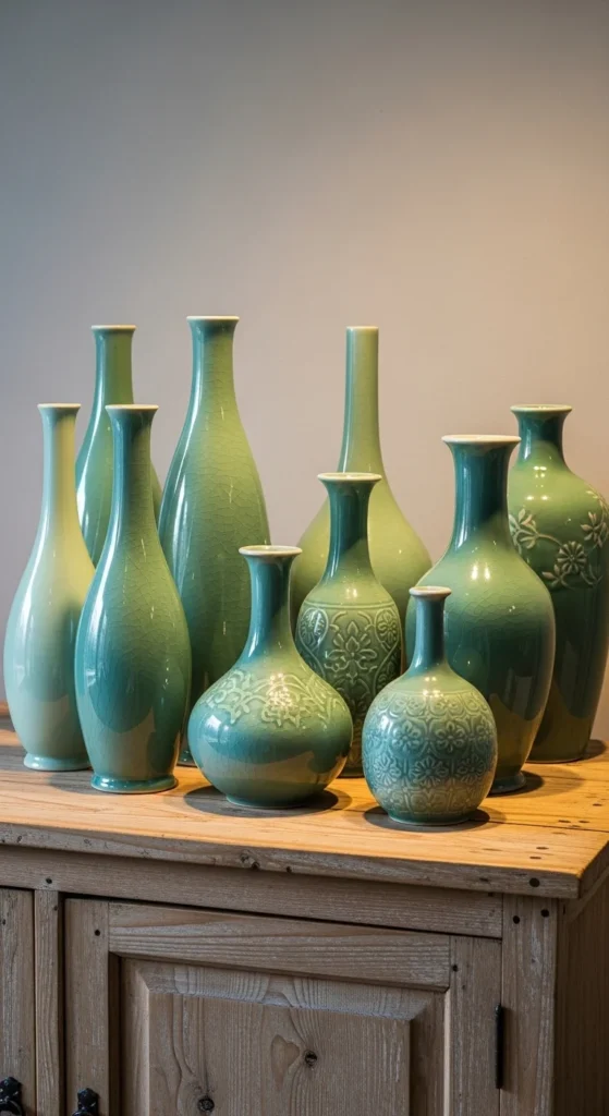 Celadon offers a softer alternative to bold greens. Use in vases, bowls, or lamps. It suits vintage or country styles. Pair with aged wood and linen. Thrift stores often carry similar ceramics.