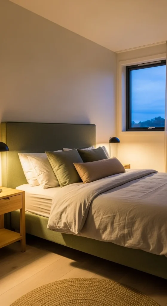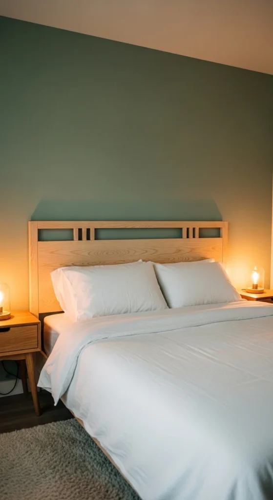 An accent wall adds focus. Choose muted green to avoid heaviness. Paint behind the headboard only. Keep other walls light. This works well in rentals using removable wallpaper.