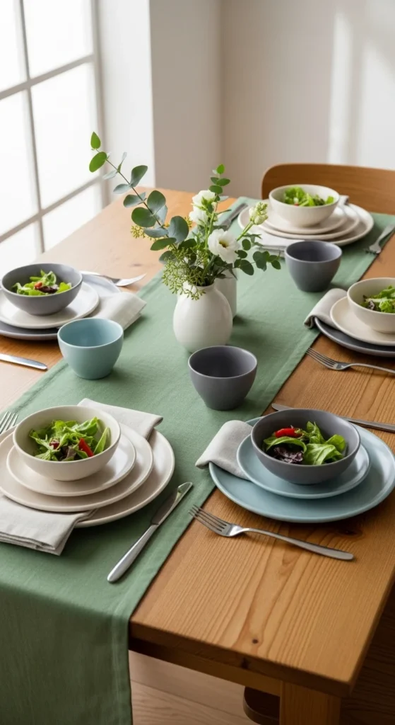 Textiles offer seasonal change without commitment. Runners, napkins, or placemats work well. Washable linen is practical. Keep patterns minimal. Solids feel calmer.