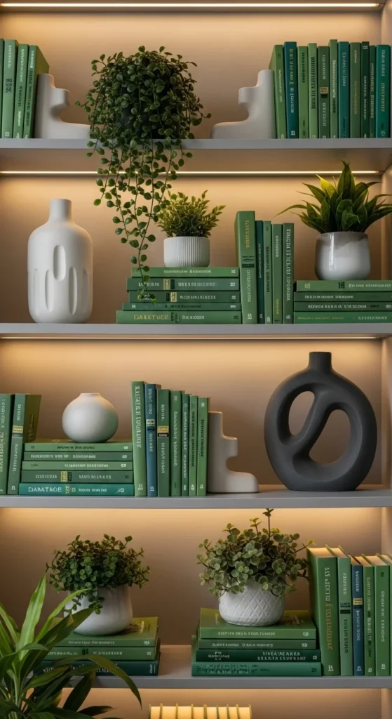 Use green as an organizing cue. Group books by tone. Add plants for variation. Leave negative space. Avoid overfilling shelves.