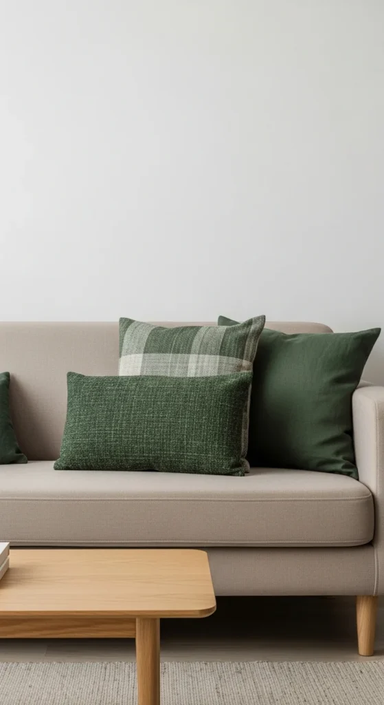 21. Forest Green Throw Pillows on Neutral Sofas