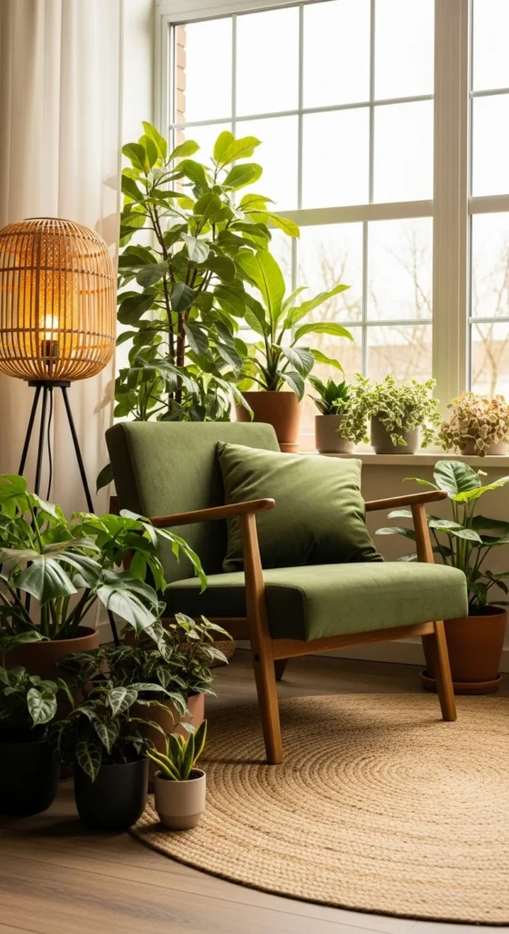 A biophilic nook combines multiple natural elements in one zone. Limit it to a corner so the rest of the room stays quiet. Use one chair, one rug, and two to three plants. Faux and real can mix. Keep greens within one family. The lighting should be warm. Avoid overhead glare. Floor lamps with woven shades work well. This setup encourages pause without clutter. Rearrange seasonally by changing textiles rather than furniture. Small spaces benefit most from this approach.