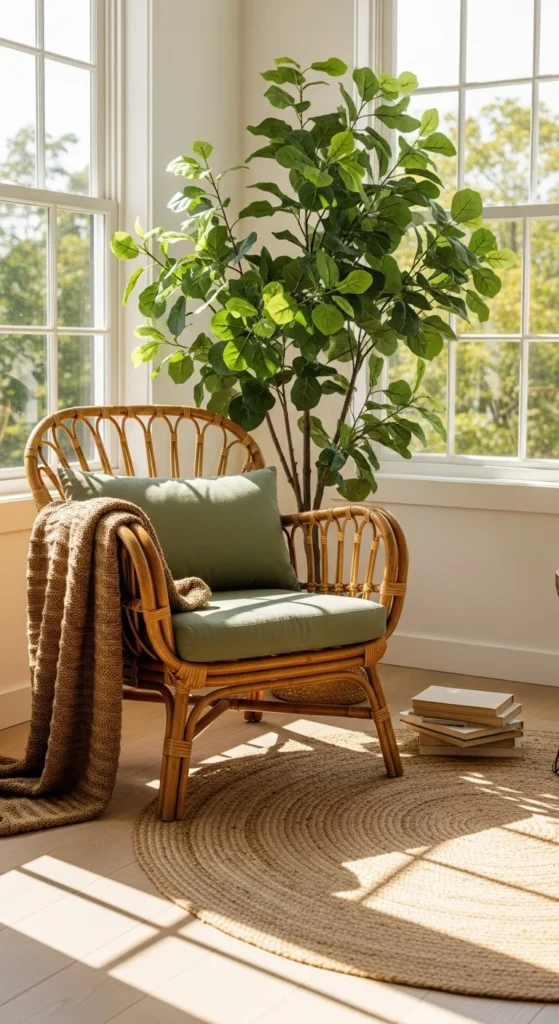 Rattan introduces organic texture instantly. One chair is enough. Add a green cushion or throw to tie the palette together. Avoid overcrowding. Let the piece breathe. Secondhand stores often carry rattan cheaply. Check joints for stability. Seal lightly to avoid splinters. Pair with jute or sisal rugs. Keep walls light for contrast.