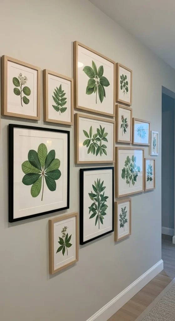 Botanical prints reinforce nature themes without live plants. Use illustrations, not photos, for timeless style. Keep frames consistent. Mix leaf shapes for variety. Print at home on textured paper for savings. Arrange on the floor first. Keep spacing equal. Hallways and staircases work well for this idea.