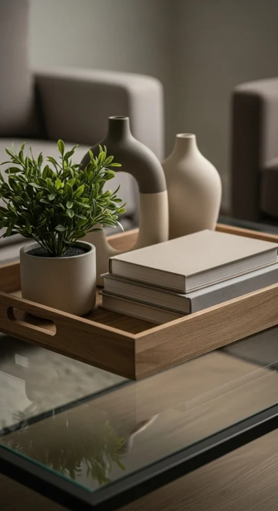Faux greenery works where sunlight is limited. Choose realistic stems with varied leaf color. Avoid symmetry. Trim stems shorter for realism. Place in trays to keep styling contained. Dust monthly. Matte leaves look more natural than glossy ones. This works well in rental spaces.