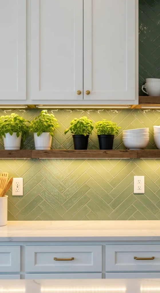Green tiles bring color without clutter. Choose handmade-look tiles for texture. Keep grout light. Dark grout can dominate. Install only on one wall if hesitant. Peel-and-stick versions work for quick updates. Pair with wood shelves instead of metal.